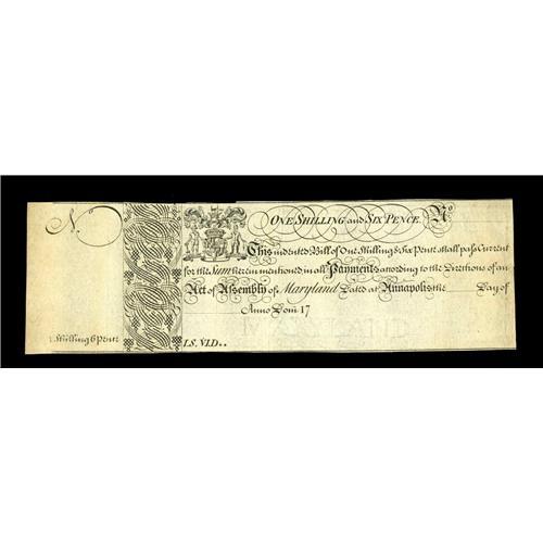 <B>Maryland 1733 1s/6d Choice About New.</B></I> A second example identical to the one above save for an extremely short split at the right.