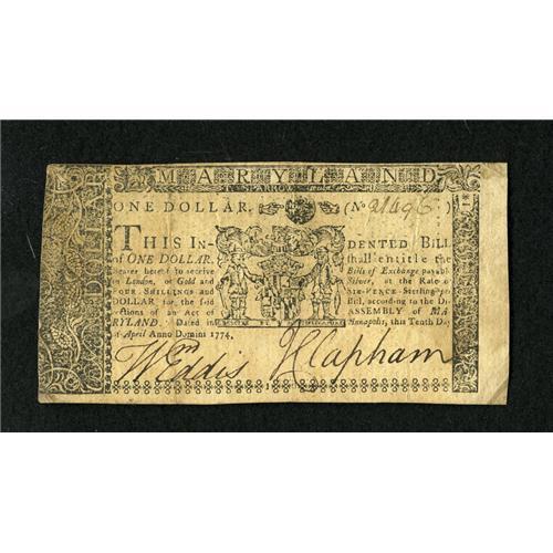 <B>Maryland April 10, 1774 $1 Extremely Fine.</B></I> A crisp and enormously margined example of this lower denomination Maryland note.<BR><BR><b>Shipping:</b> Coins & Currency (<a target="_blank" href="http://www.heritageauctions.com/common/shipping.php">view shipping information</a>)