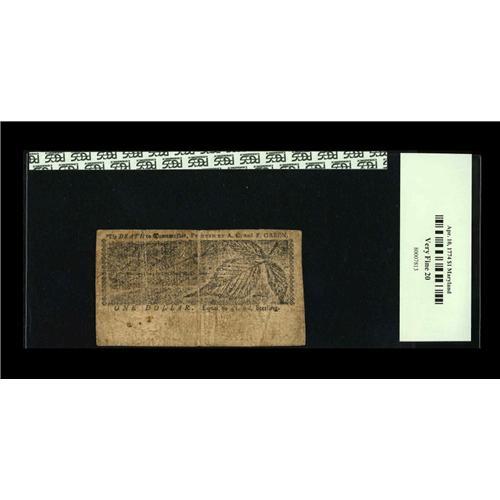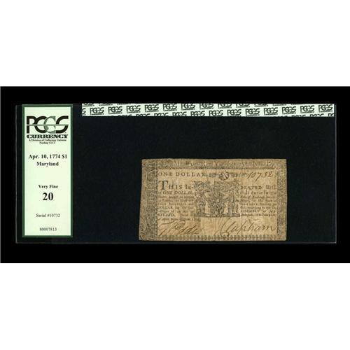 Maryland April 10, 1774 $1 PCGS Very Fine 20. Typical g Maryland April 10, 1774 $1 PCGS Very Fine 20