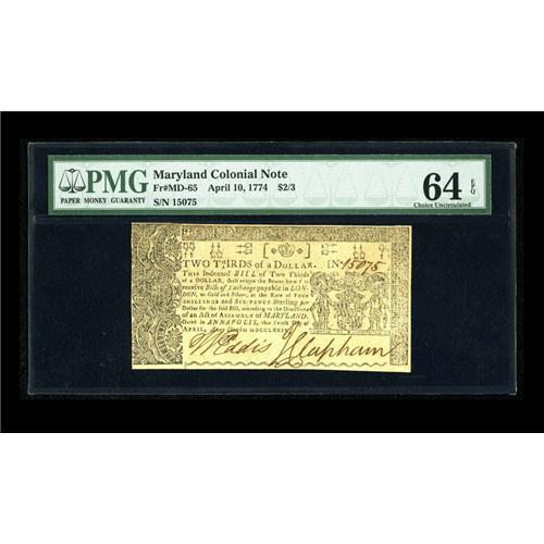 <B>Maryland April 10, 1774 $2/3 PMG Choice Uncirculated 64EPQ.</B></I> Anyone who has spent any time collecting or dealing in Colonial currency is well aware that this issue is one of the most common in Fine to Extremely Fine grades, but is a major rarity at 60 and above. This piece is to date the highest note graded by PMG for the eleven different denominations of this issue. Only three other pieces have been graded 60 and above.<BR><BR><b>Shipping:</b> Coins & Currency (<a target="_blank" href="http://www.heritageauctions.com/common/shipping.php">view shipping information</a>)