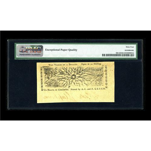 Maryland April 10, 1774 $2/3 PMG Choice Uncirculated 64