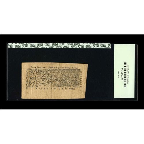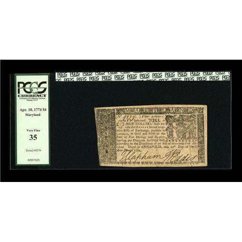 <B>Maryland April 10, 1774 $4 PCGS Very Fine 35.</B></I> Another clean, beautifully margined example. This is the most common Maryland issue, but they are seldom seen with this nice an appearance.