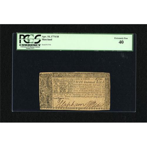 <B>Maryland April 10, 1774 $8 PCGS Extremely Fine 40.</B></I> This is a pleasing note with a strong signature.<BR><BR><b>Shipping:</b> Coins & Currency (<a target="_blank" href="http://www.heritageauctions.com/common/shipping.php">view shipping information</a>)