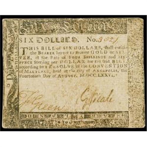 Maryland, August 14, 1776, $6, Choice About Extremely Fine.