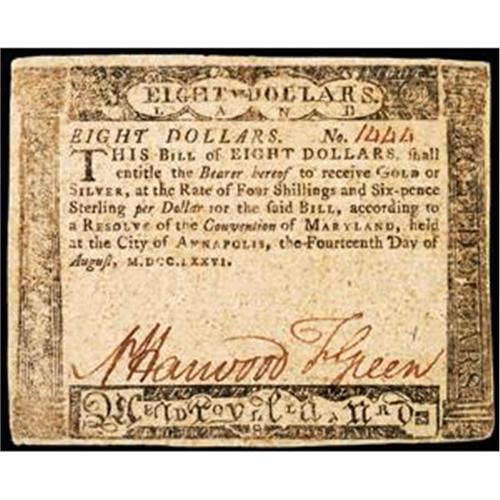 Maryland, August 14, 1776, $8, Choice Extremely Fine.