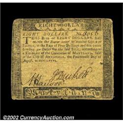 Maryland August 14, 1776 $8 Very Fine. A less common Maryland issue and a rather nice example. Impor