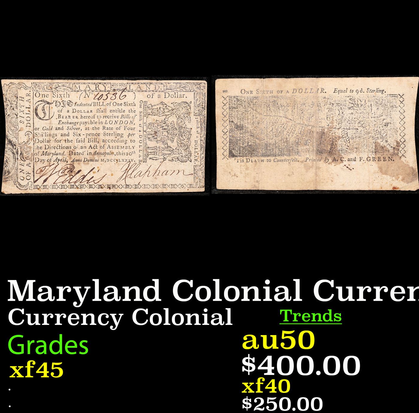 Maryland Colonial Currency April 10th, 1774 1/6 Dollar (1/6d) Fr-MD61 Printed By A.C. and F. Green G