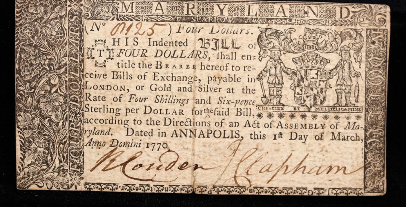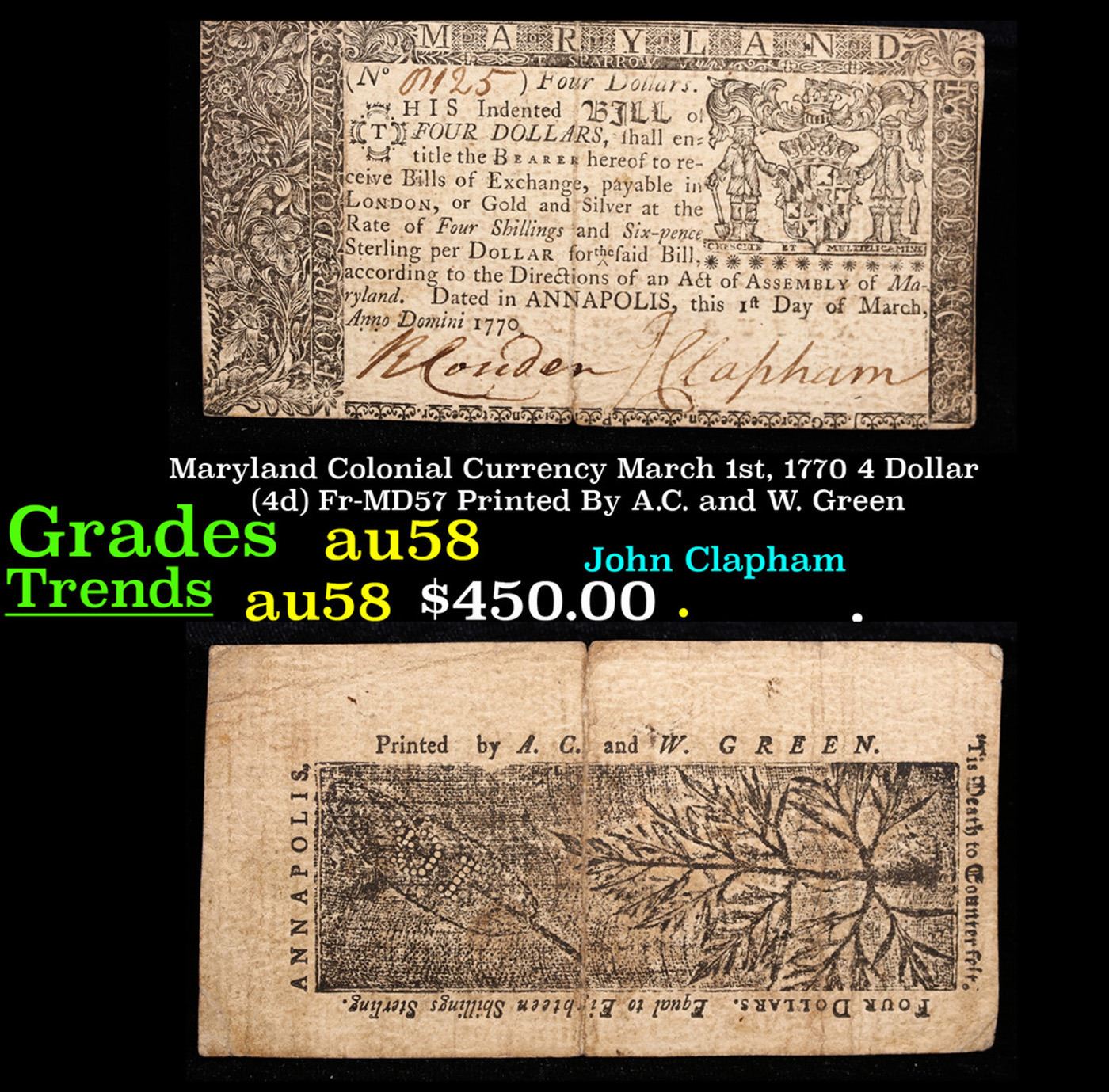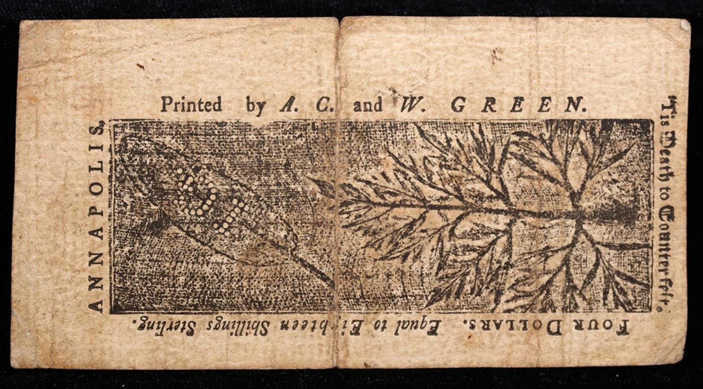 Maryland Colonial Currency March 1st, 1770 4 Dollar (4d) Fr-MD57 Printed By A.C. and W. Green Grades