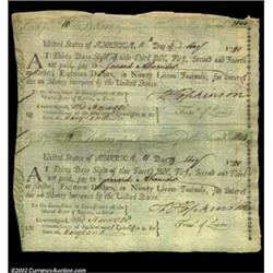 Maryland Continental Loan Office Bill of Exchange May 11, 1781 Choice New. Identical but for date to the pair we offered in a collection of these Continental Loan Office notes last January. Listed as U.S. 95 in Anderson, it's an uncut pair consisting of a third and fourth of exchange made out for $18. Both notes from this vertical pair are signed by Francis Hopkinson as Treasurer of Loans and by Thomas Harwood for the State of Maryland. Maryland is the second-most difficult colony from which to obtain one of these certificates. They're rated as a high R-7, which Anderson considers to be four to six known, in his excellent book The Price of Liberty. Only Virginia, with one to three known, is considered rarer. This unsevered pair is in essentially as-issued condition but for some extremely minor edge tears at the top that do not reach any portion of the design. This lovely and valuable pair should create considerable bidder interest. Important notice: We expect to be auctioning lots at the rate of 200-250 per hour. Sometimes eBay Premier live bid software cannot keep up with that pace, so we strongly recommend that you place a realistic proxy bid now as insurance to avoid disappointment. Also please note that all Heritage/CAA lots purchased through eBay Premier carry a 20% Buyer's Premium. Please make sure you read the Terms and Conditions.