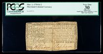 Maryland Mar. 1, 1770 $1/2. PCGS Very Fine 30 Apparent. A well-printed note that retains bold signatures and faces up nicely overall. Small edge tears, pinholes, and a center split that was tape repaired are listed as the reasons for the Apparent grade.
