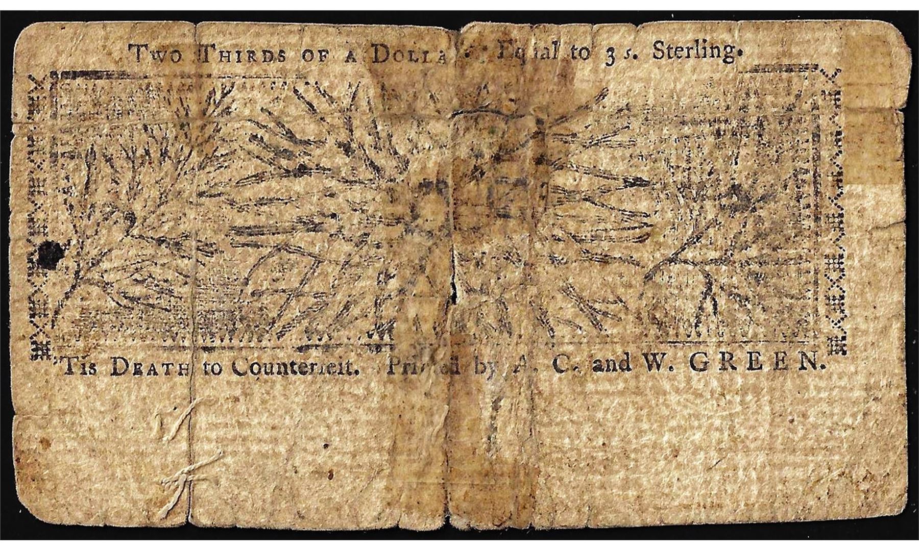 One Maryland Two Thirds of a Dollar Colonial Currency Note.