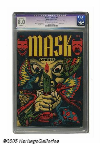 <B>Mask Comics #1 (Rural Home, 1945) CGC Apparent VF 8.0 Slight (P) Off-white to white pages.</B></I> This highly desirable book features a classic L. B. Cole cover. Covers by Cole are a well-established area of collecting, and are highly prized for his unique and colorful style. CGC notes, "Restoration includes: small amount of color touch on cover, piece re-attached with glue." Overstreet 2005 VF 8.0 value = $1,825.