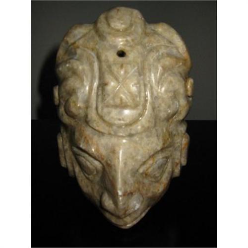 This 7 inch mask is made of stone carved on, and is very decorative. The color is multi grain,light grey or beige with touches of soft peach and few lines of brown or peach. It also has all the magnificent shines on the front and the back. It has hole for wall hanging or stand alone with 3 inch on the bottom. It is fairly heavy with very good condition. The width is 5 inch and the depth is 4.5 inch. It has several imperfections blend in to the stone. It is just Lovely!