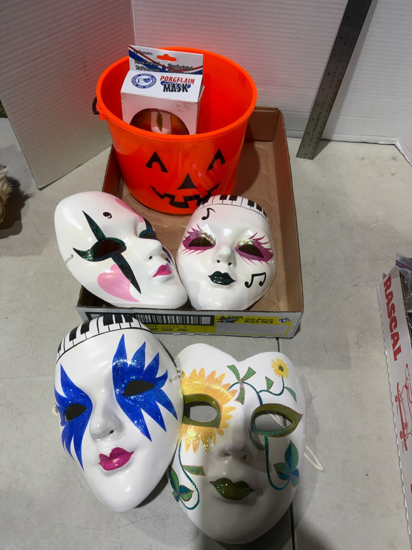 Masks and pumpkin bucket