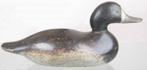 Mason Factory Challenge Grade bluebill hen in good OP with possible t/u to the mid section on the back and the white below the water line. Few line age checks on the body and a coat of wax or sealer on the surface. Provenance: Pitt Collection.