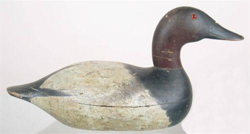 Mason Factory Seneca Lake canvasback drake decoy with glass eyes and SV written on the bottom. OP with a fair amount of in use wear, a clean neck check, numerous line age checks and narrow seam separation along both sides. Neck filler missing, Struck by shot. Weight removed.
