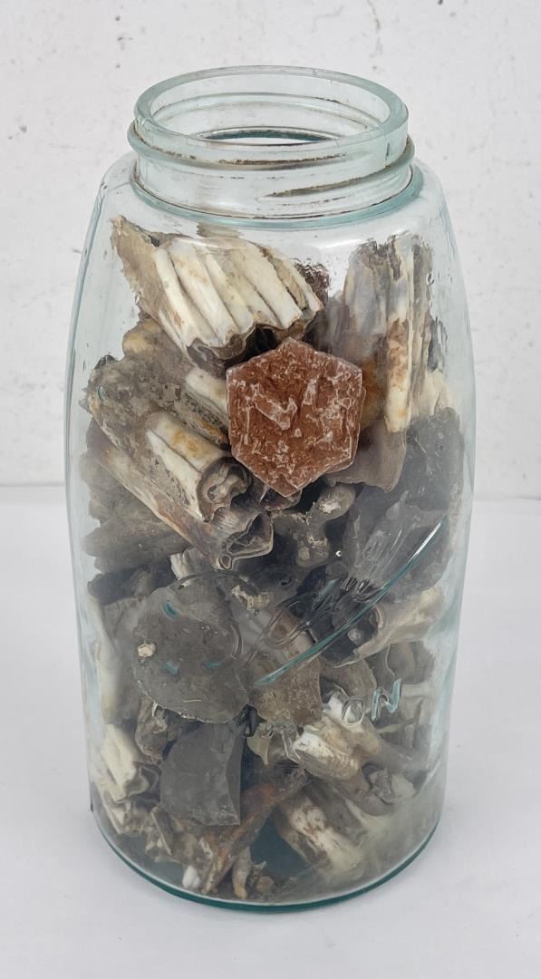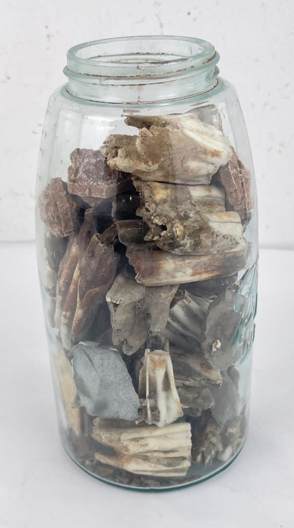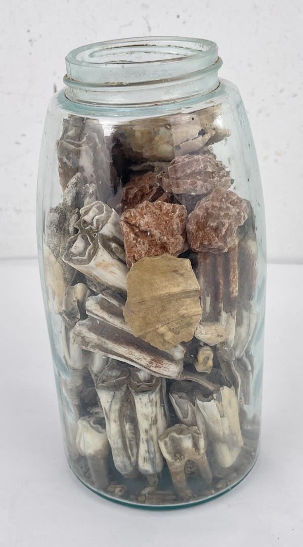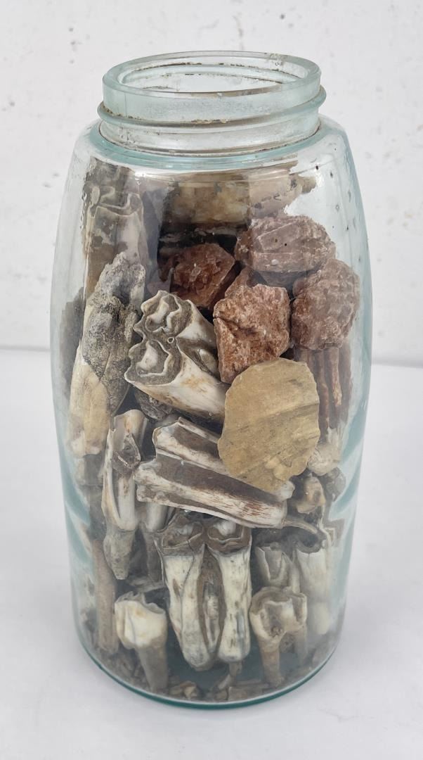 Nice old jar full of teeth. As found at Buffalo Jumps and in River beds here in Montana.