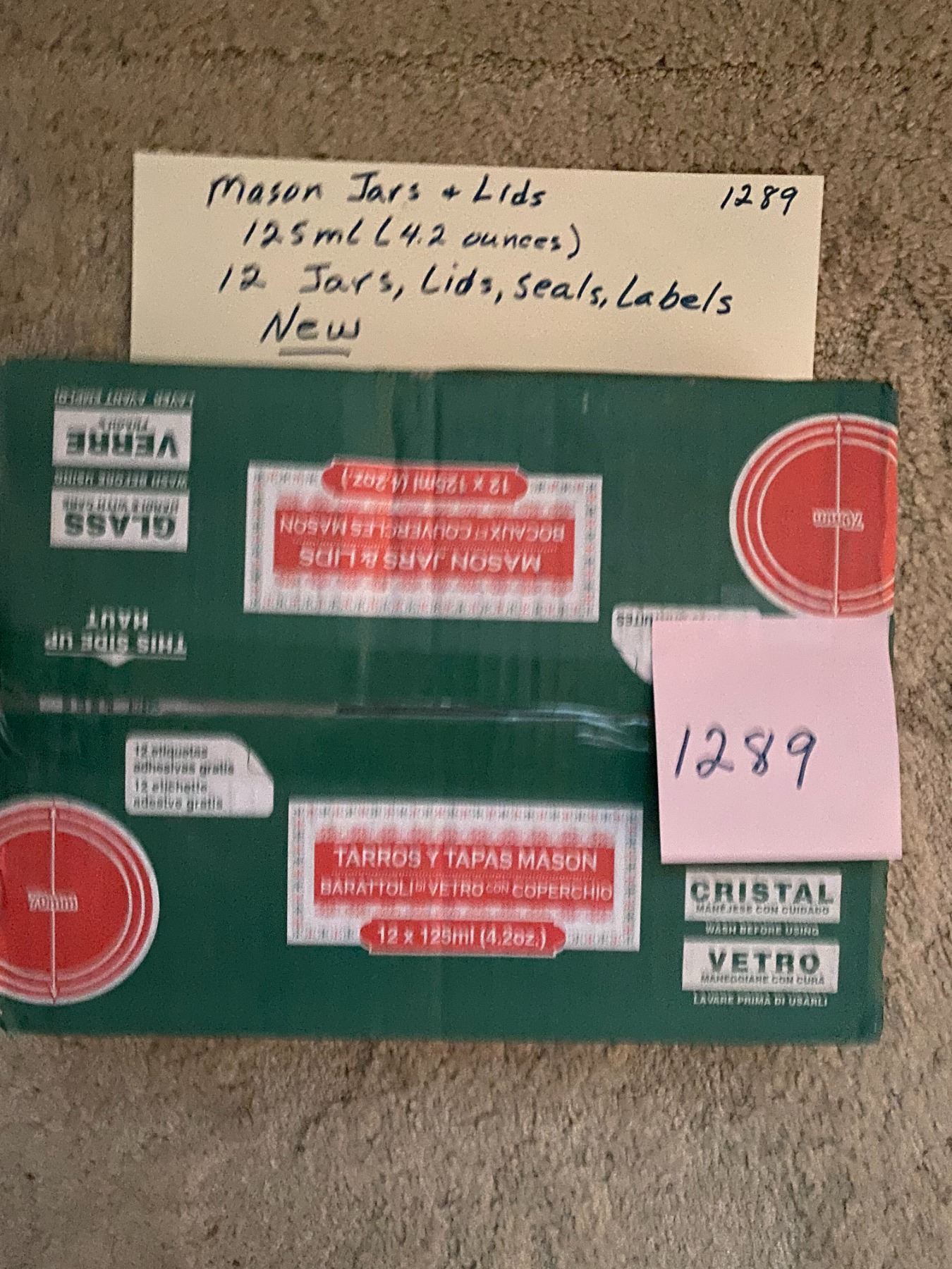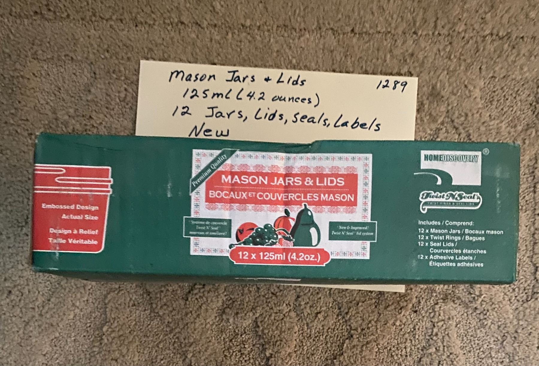 Mason Jars, 125 ml (4.2 ounces), Box of 12. New. Includes 12 Jars, Rings, Seals, and Labels.