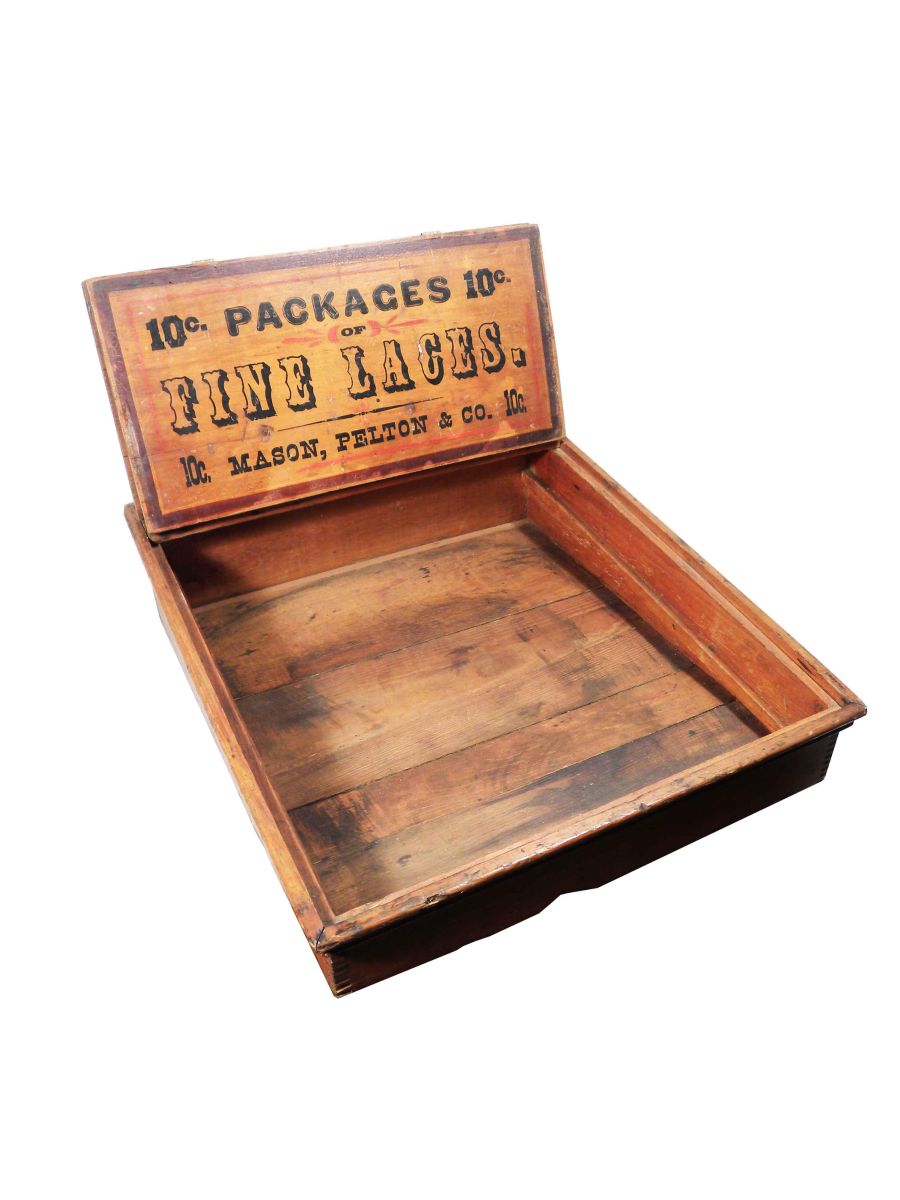 Mason Pelton & Co. Fine Shoe Laces, wood store display, 10 cents. Good original condition. 17 1/2 X 5 X 20 inches closed.