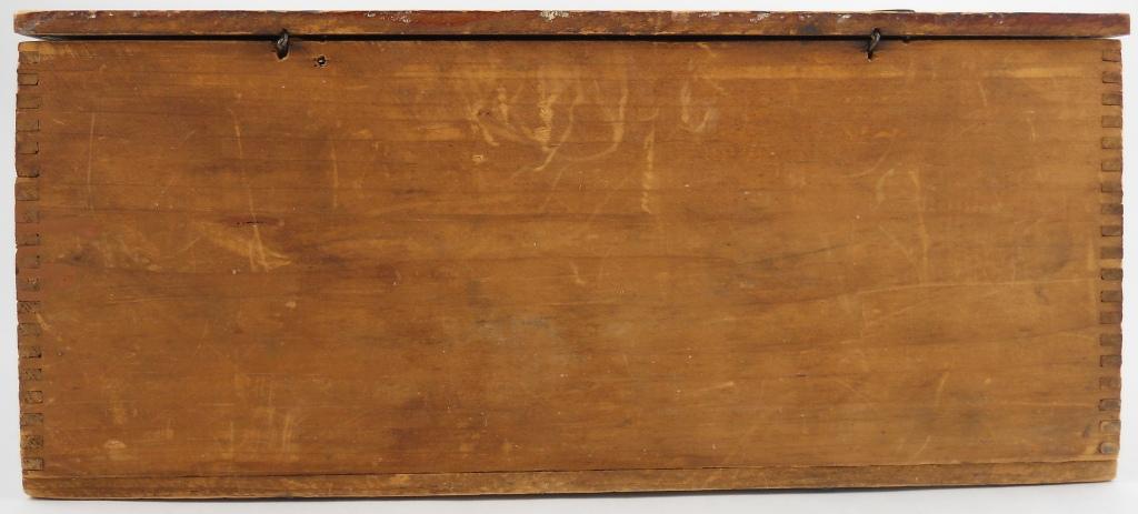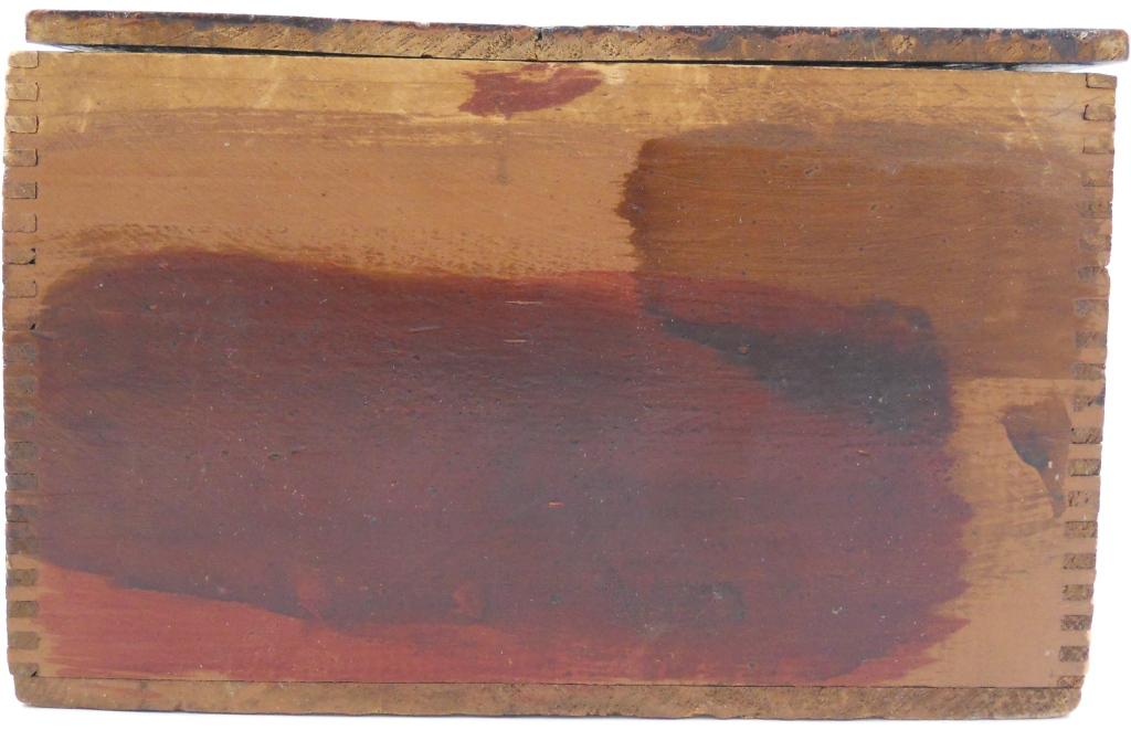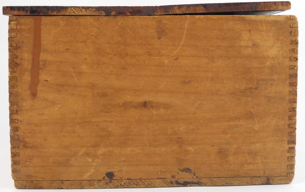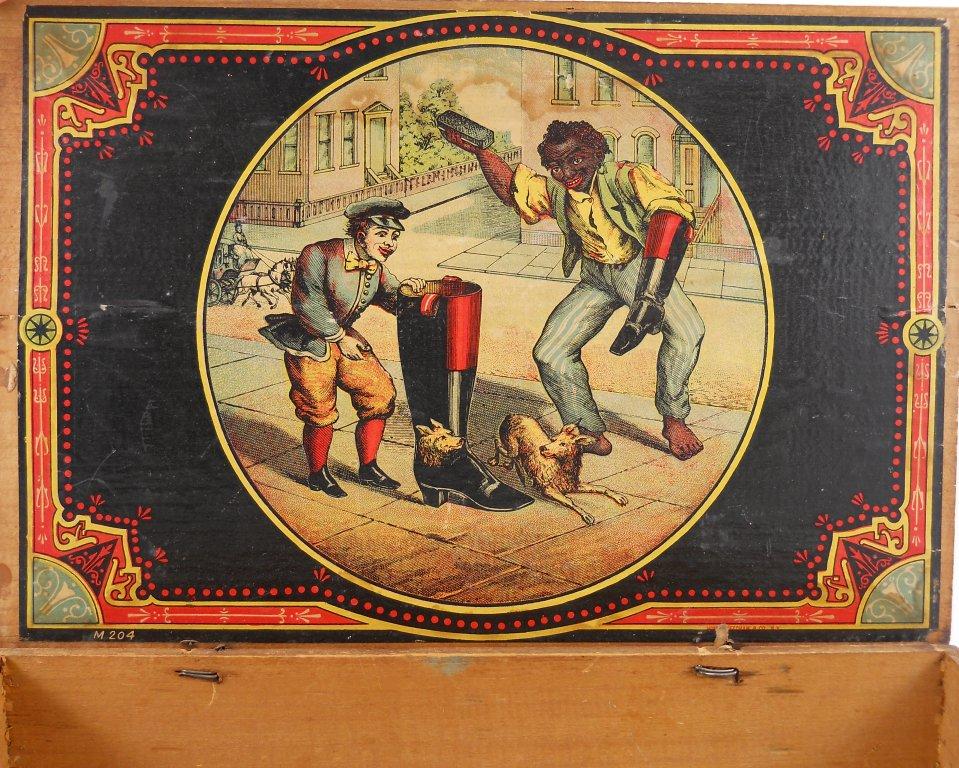 This is a shipping box that, with the lid open, acts as a display. The box is 11-1/2 inches x 7-3/4 inches x 5 inches. The inside label looks to be complete. The box has normal wear and tear; the front outside label is stained and faded, with paper loss along the top edge. This is a great piece of Black Memorabilia !