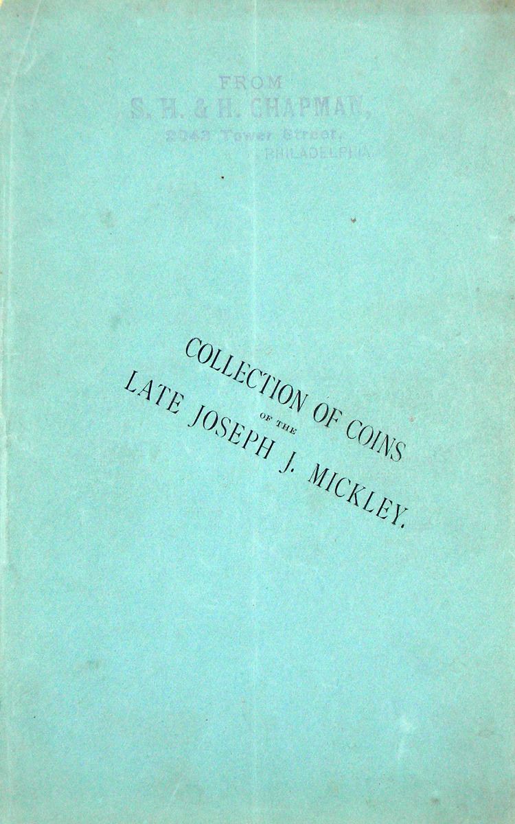 [Mason & Co.] Thomas, M., & Sons. CATALOGUE OF THE VALUABLE COLLECTION OF COINS OF THE LATE JOSEPH J. MICKLEY... Nov. 5-6, 1878. 8vo, original printed wraps. (2), 55, (1) pages; 1093 lots. Folded for mailing; very good. Very scarce. Of this auction, issued several months after Mickley’s death, Frossard observed in Numisma: “To judge by the catalogue, compiled by E. Mason, Jr., this sale will be one of the most attractive of the season... The American series contain pieces for the purchase of which the most lively competition will take place, and the Numismatic books alone would have been worthy of a separate catalogue.” Not listed in Adams in 1982, but accorded number 17A in the 2001 Additions & Corrections.