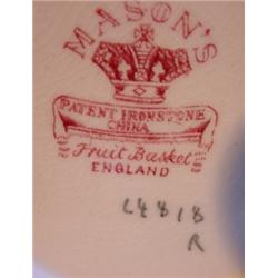 Mason's fruit basket pattern pitcher. Measures 6" tall and is in excellent condition. Marked on bottom Mason's trademark.