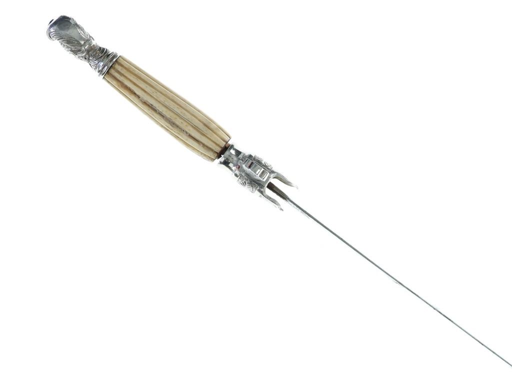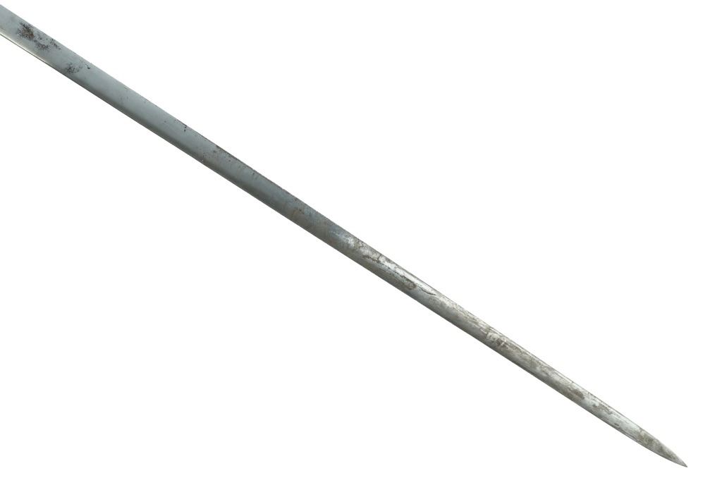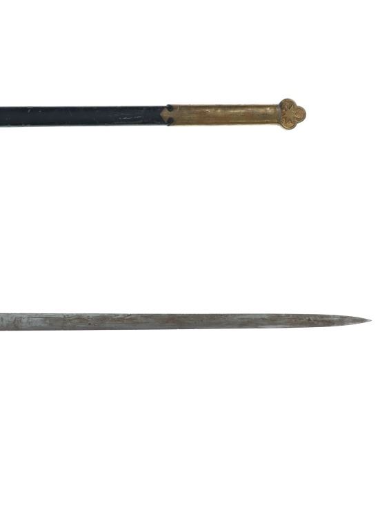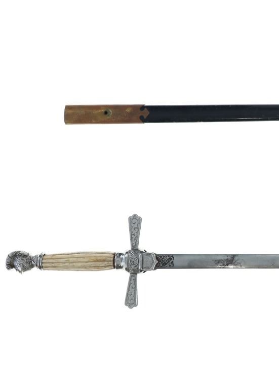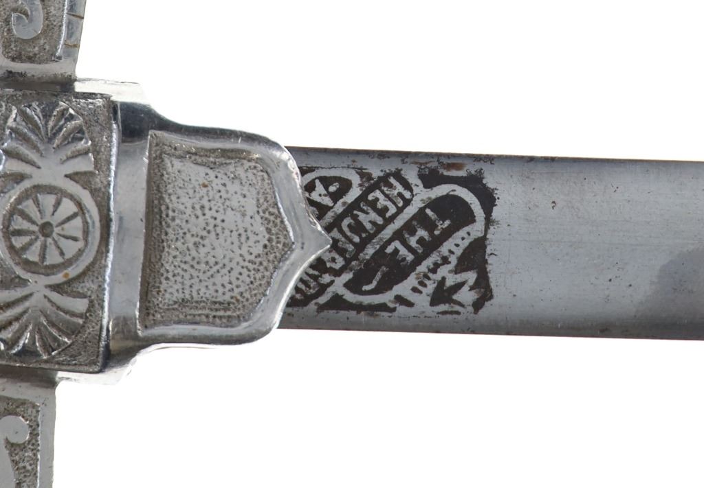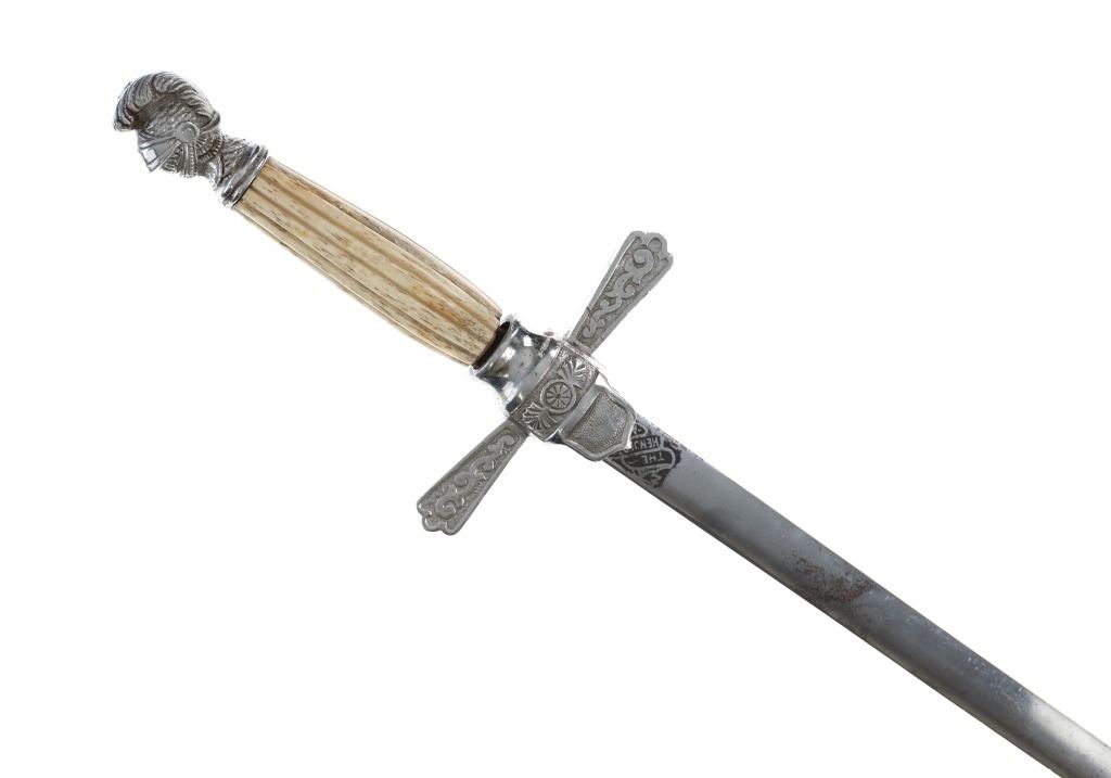 Featured in this lot is this Masonic Knight ceremonial sword circa early 1900's. The sword features a wonderfully and professionally crafted stainless steel, brass, and bone construction that features a knights head on the pommel with Masonic geometric decorations adorning the hilt. The sword is marked on the blade above the hilt as follows: The Henderson - Ames Co. - Kalamaka. The condition of this Masonic Knight ceremonial sword is fair to good with a slight crack in the bone handle and shows some patina adorning the sword but shows fair to good overall condition. The measurements of this sword is 35 1/4" x 4 1/2" x 3/4".