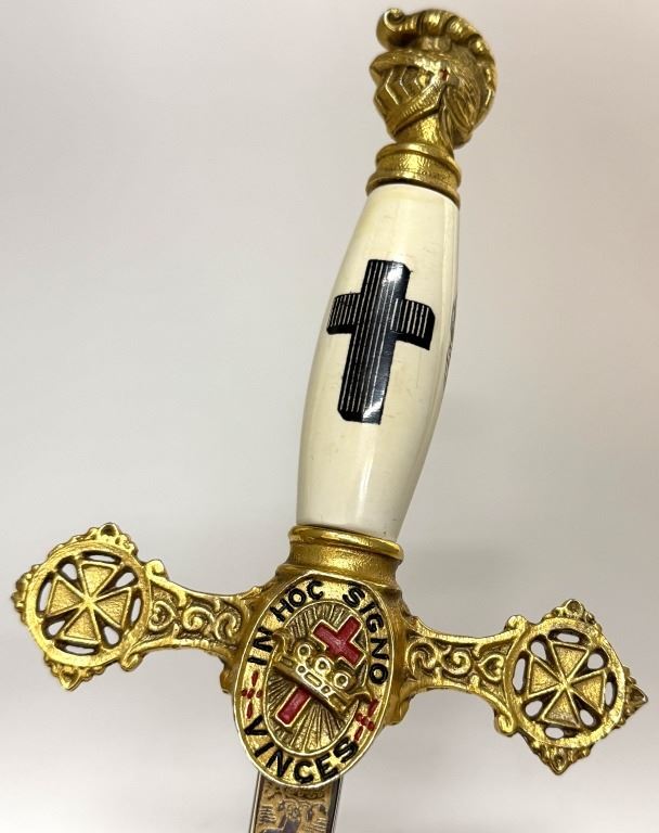 Item/Description: Featuring a Masonic Knights Templar Fraternal Lodge Ceremonial Dress Sword with sheath and leather carry case. Sword inscribed "in hoc signo vinces", a Latin phrase conventionally translated into English as "In this sign thou shalt conquer." (Masons, Fraternal Lodge, Ceremonial Regalia)