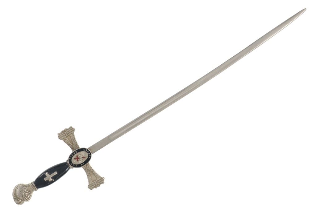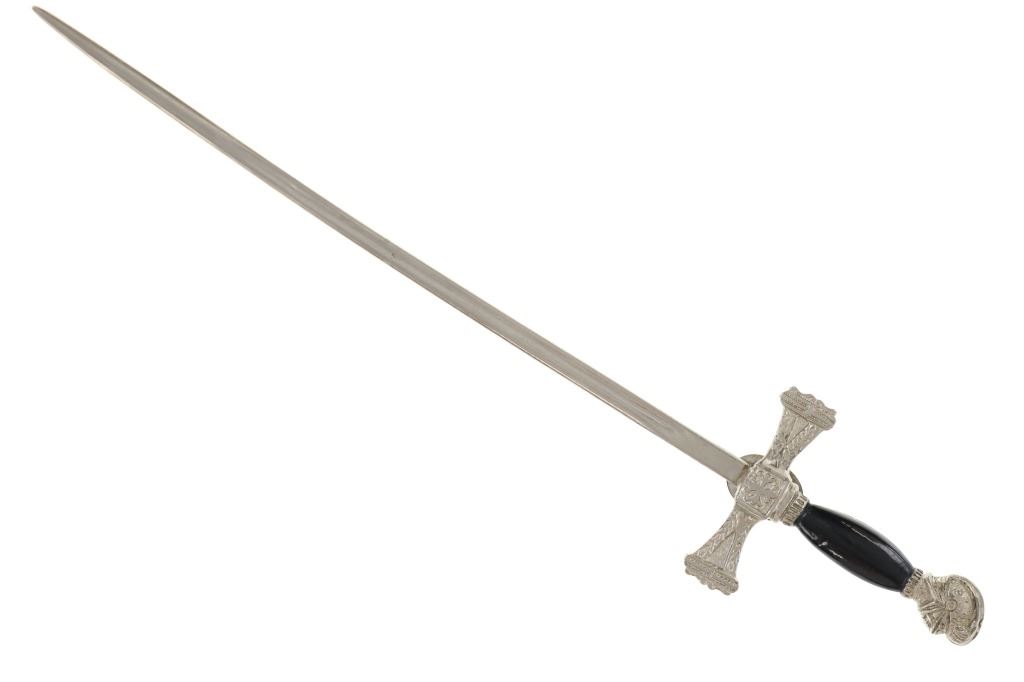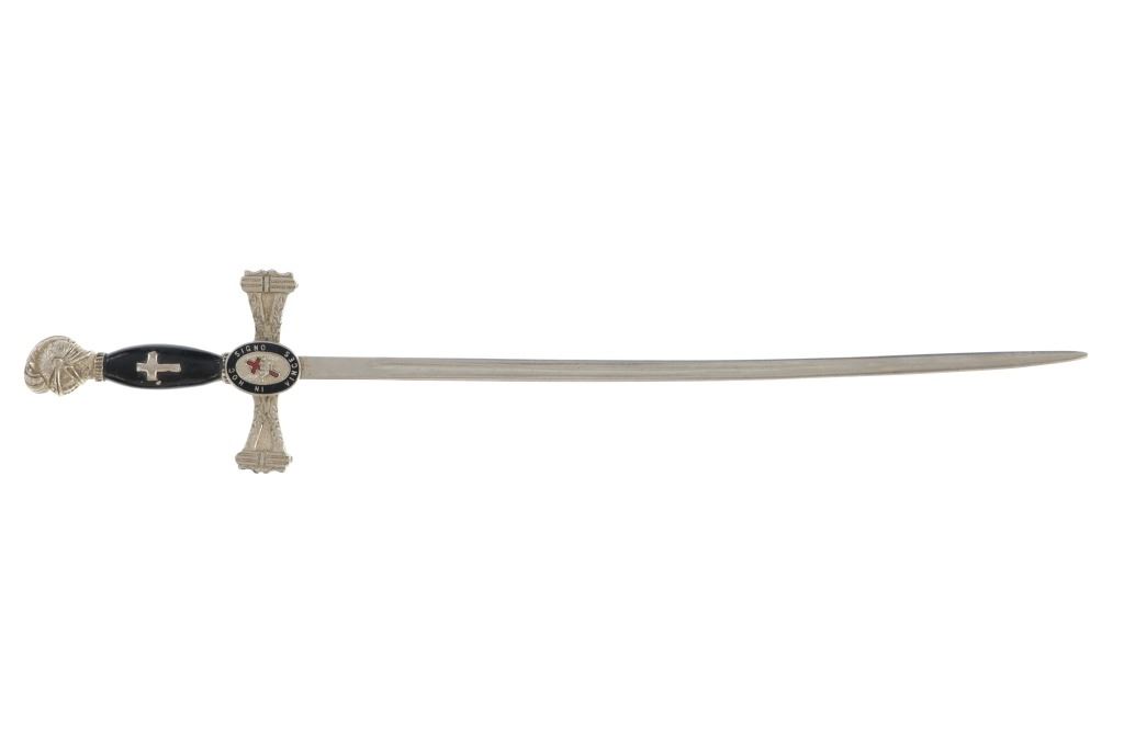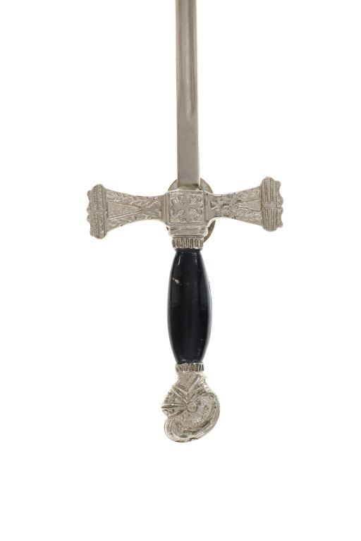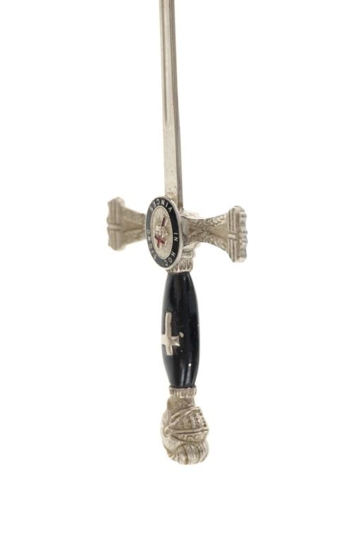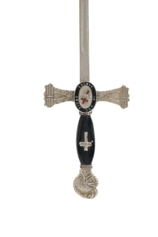 Featured in this lot is this Masonic Knights Templar miniature ceremonial sword. The sword features a wonderfully and professionally crafted steel and and aluminum construction that shows a silver inlay of a cross on the handle and the pommel shows a knights helmet with a repousse decoration the the hilt. The insignia attached to the hilt is of an early rendition of a sect of the Knights Templar that shows a red cross with a crown around it and reads as follows: In Hoc Signo Vinces. "In hoc signo vinces" is a Latin phrase that translates to "In this sign you will conquer" or "In this sign thou shalt conquer". It is associated with Constantine the Great, who saw the phrase in a vision before a battle. The condition of this miniature sword is good with some slight patina to the blade and hilt of the sword but otherwise shows a good overall condition. The measurements of this miniature sword is 9 5/8" x 1 7/8" x 1/2". The collective weight of this miniature sword is 39.5g.