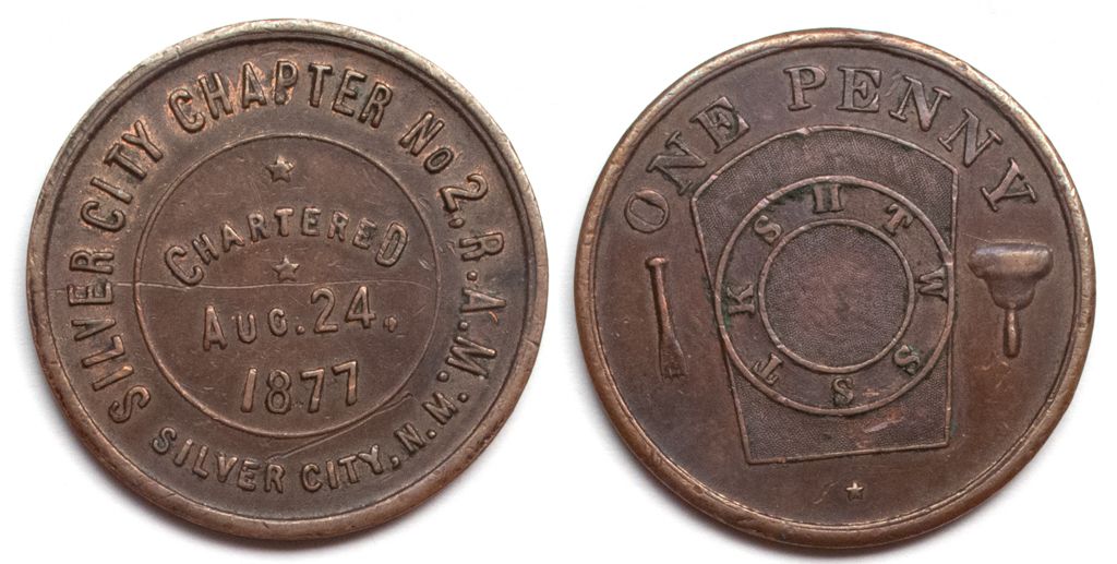 Obverse: Silver City Chapter No. 2 R.A.M./Chartered/Aug. 24,/1877/Silver City, N.M.//One Penny/T K S H T W S S. Copper, 31mm.City: Silver CityCounty: Cochise State: NMDate: