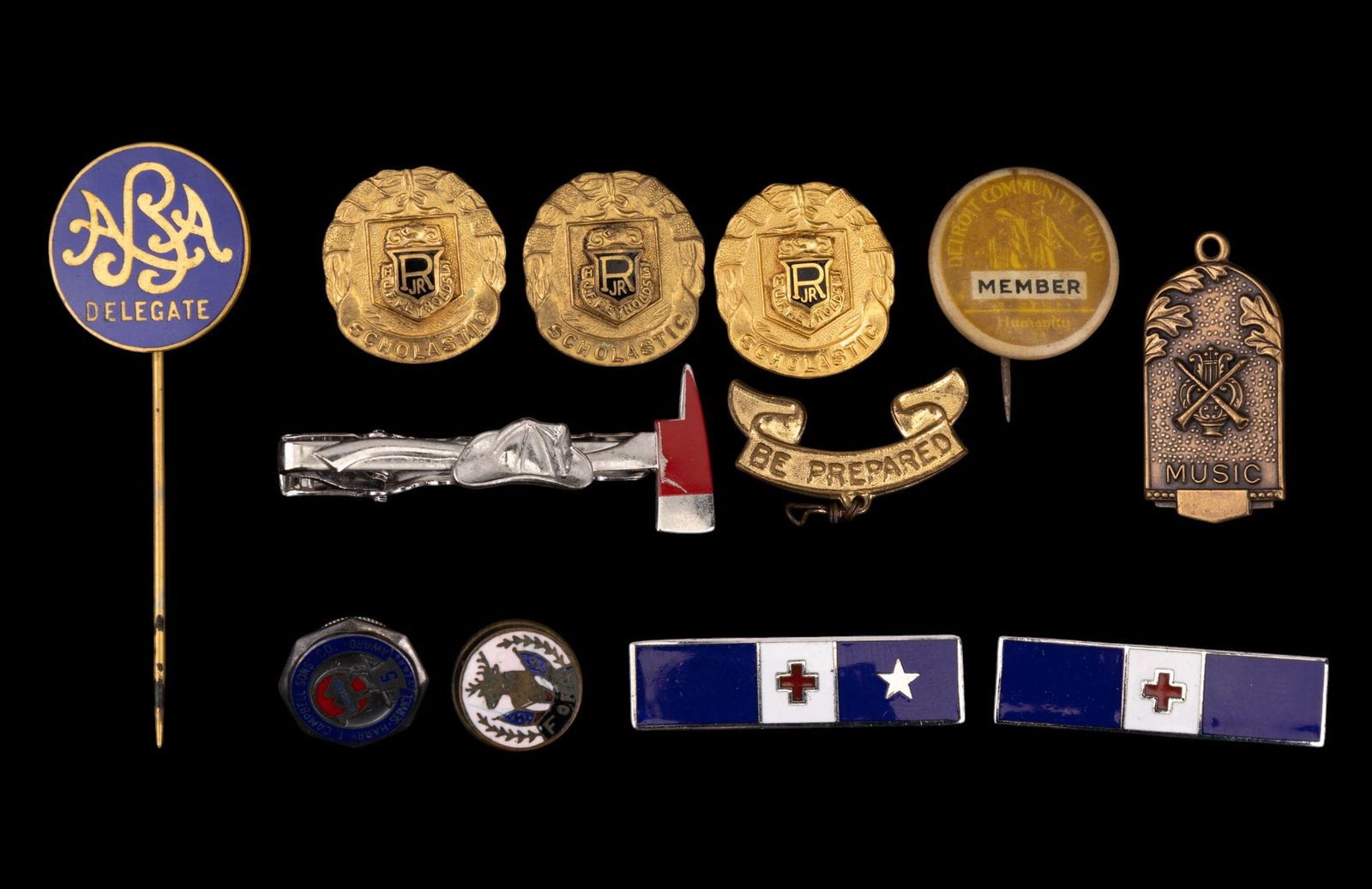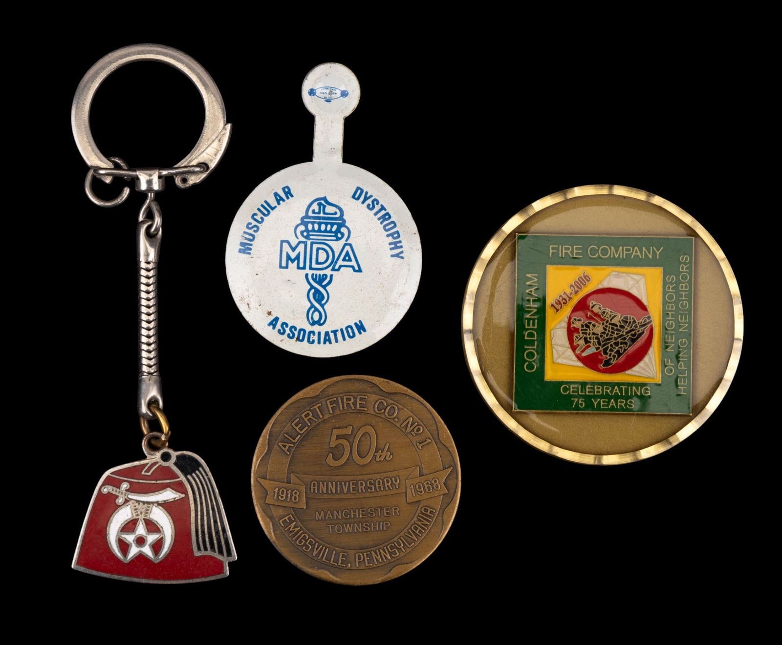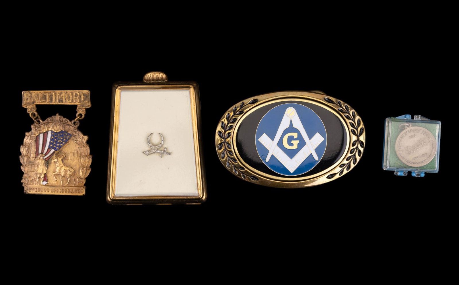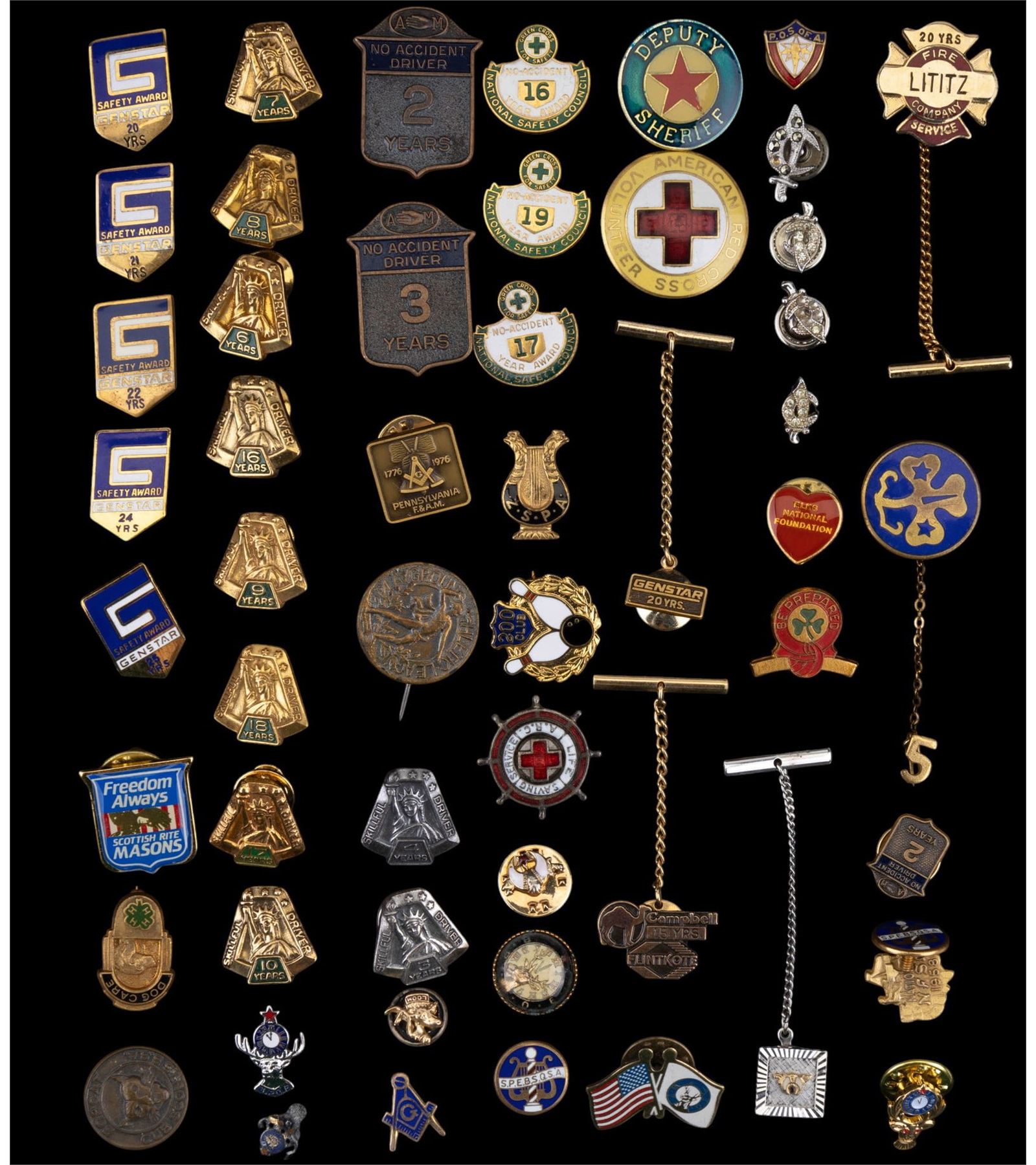 Shriners International Ancient Arabic Order of the Nobles of the Mystic Shrine fez keychain, pins, & powder compact; Masonic square & compasses brass belt buckle & pins; Benevolent and Protective Order of Elks pins; Harry T. Campbell Sons' Co. service award pins; Be Prepared & WAGGGS clover Girl Scouts pins; Cub Scouts bobcat pin; 4H Club Dog Care lapel pin; pins awarded for safe driving; J.F. Reynolds scholastic pins; S.P.E.B.S.Q.S.A. Barbershop Harmony Society lapel pins & other music-related pins; American Red Cross pins; Fire Company medallions, tie tack, & tie clip; & more. Masonic belt buckle measures approx. 2.25" x 3.5". There are 75+ total pieces. See photos for further details.