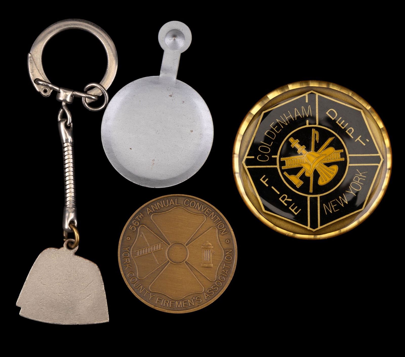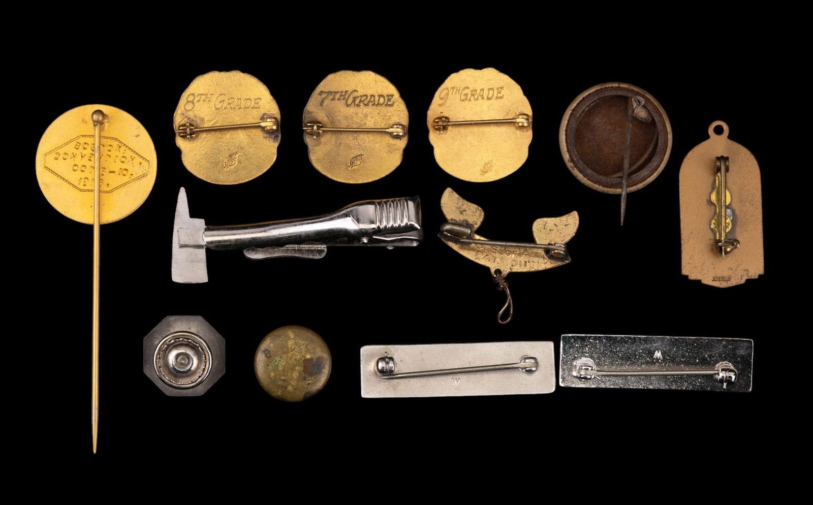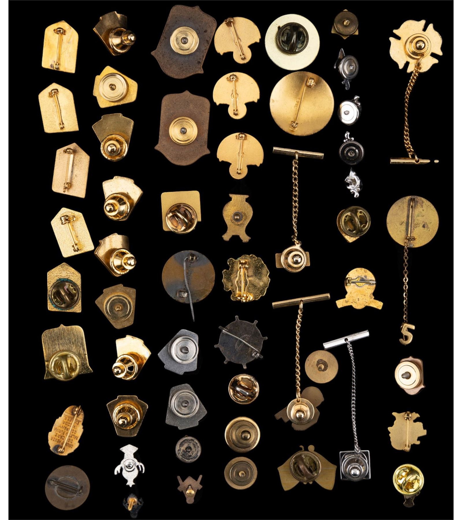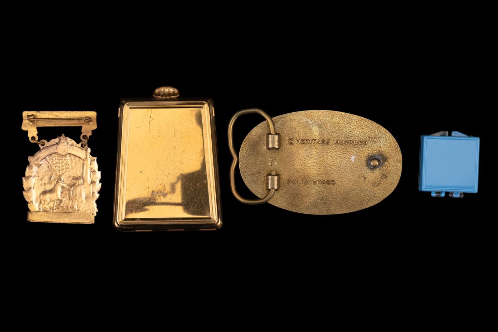 Shriners International Ancient Arabic Order of the Nobles of the Mystic Shrine fez keychain, pins, & powder compact; Masonic square & compasses brass belt buckle & pins; Benevolent and Protective Order of Elks pins; Harry T. Campbell Sons' Co. service award pins; Be Prepared & WAGGGS clover Girl Scouts pins; Cub Scouts bobcat pin; 4H Club Dog Care lapel pin; pins awarded for safe driving; J.F. Reynolds scholastic pins; S.P.E.B.S.Q.S.A. Barbershop Harmony Society lapel pins & other music-related pins; American Red Cross pins; Fire Company medallions, tie tack, & tie clip; & more. Masonic belt buckle measures approx. 2.25" x 3.5". There are 75+ total pieces. See photos for further details.