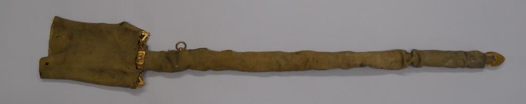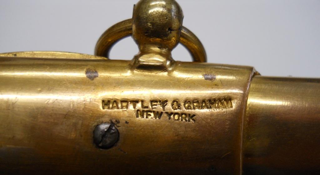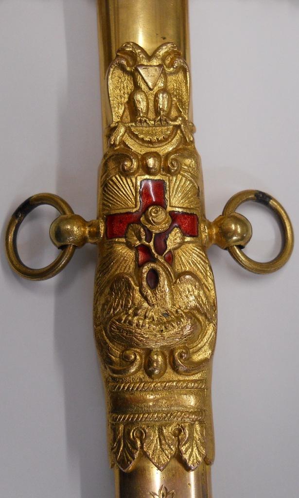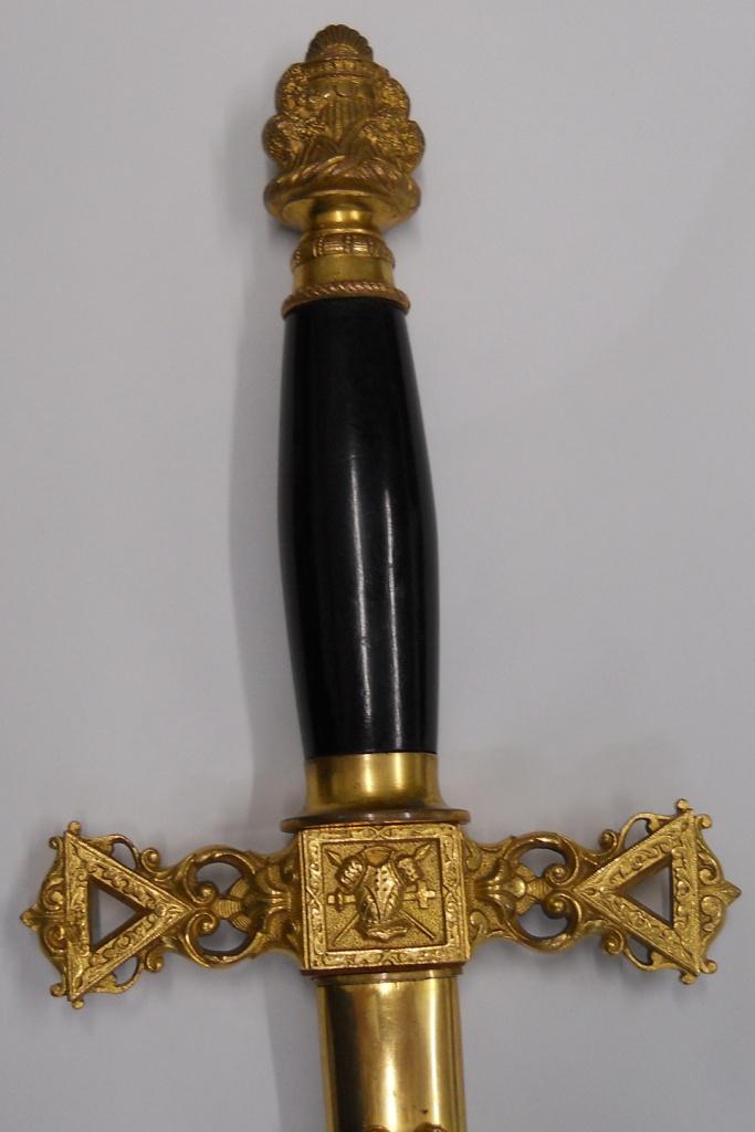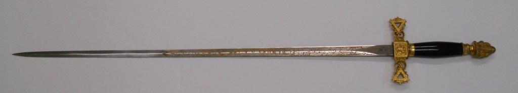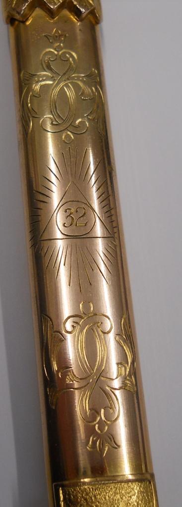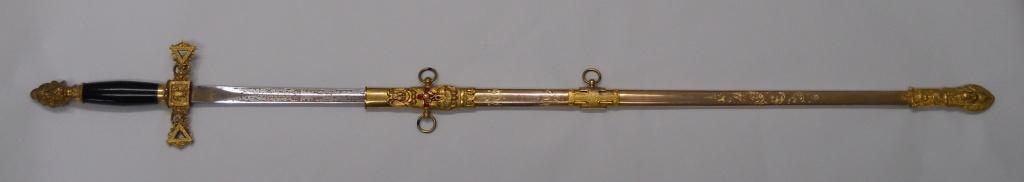 This sword in scabbard measures 37-3/4 inches long. The scabbard has a red enamel cross, and there is a "32" engraved in the triangle as well. The back of the scabbard is marked with the maker's name of "HARTLEY & GRAHAM - NEW YORK."