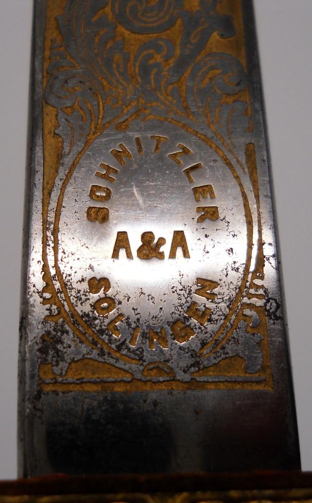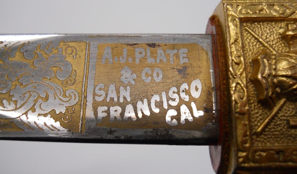 The blade has gold highlights and the owners name, "T.O. WALTER," on one side. The other side has a nicely detailed scene of knights and chivalry in the Holy Land. The blade is marked on one side with the maker's name "A.J. PLATE & CO. - SAN FRANCISCO, CAL." And on the other side "SOHNITZLER SOLINGEN - A&A"