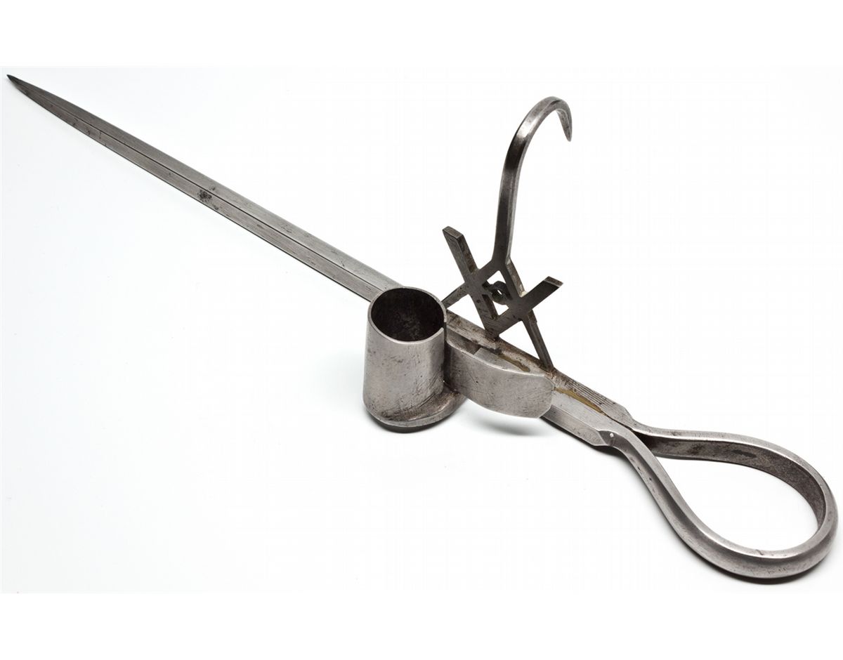 Fraternal blacksmith model. Measures about 13” and made out steel. Masonic symbol is placed on the bottom of the hook. There is some wear, and could have possibly been owned by an engineer or owner of a mine. This model is very similar to others from the time period, including another Masonic candlestick featured in A Collector’s Guide to Antique Miner’s Candlesticks, No maker listed, could have been a specially made candlestick. Not listed in Wilson, RSC 45. - Ken & Rosemary Roberts Collection -59156