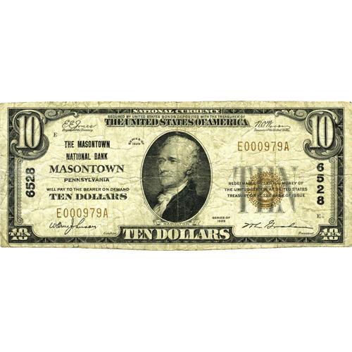 <B>Masontown, PA</B></I> - $10 1929 Ty. 1 <B>The Masontown NB</B></I> Ch. # 6528<BR>A Kelly premium of $300 definitely seems conservative considering this is only the fourth small size note to be reported on the bank. A $10 note is listed in the census without a serial number and may well be this piece, thus leaving three notes available to collectors. The note, while well-circulated, is wholly intact. <B>Fine.</B></I>