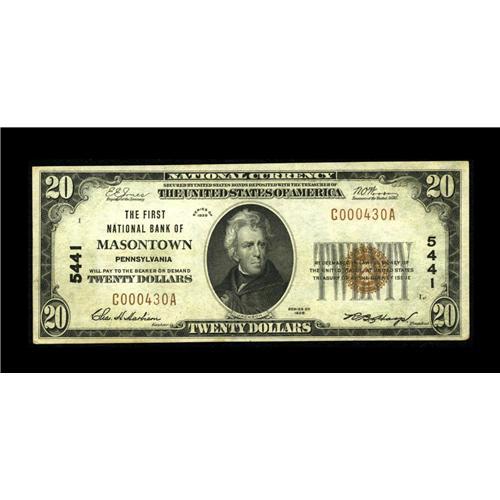 <B>Masontown, PA</B></I> - $20 1929 Ty. 1 <B>The First NB</B></I> Ch. # 5441<BR>This <B>About Uncirculated</B></I> addition to the census is the nicest small size note yet uncovered from here. Just a light centerfold and a rounded lower right corner from a higher grade.<BR><BR><b>Shipping:</b> Coin/Currency (<a target="_blank" href="http://www.heritageauctions.com/common/shipping.php">view shipping information</a>)