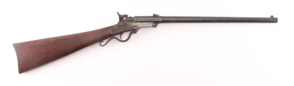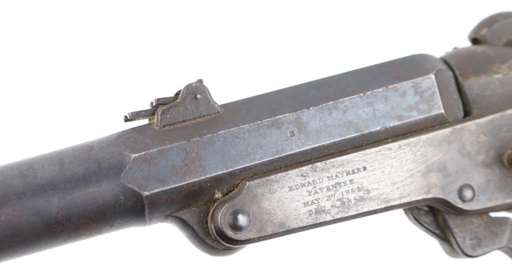 SN: 9825 Civil War carbine used by US Cavalry, manufactured circa 1863 to 1865. Approx 20,000 of the "second model" were made. Features 20" barrel with octagonal breech section, no forend, blade front sight, folding leaf rear sight with 3 elevation settings, finger lever opening, external hammer, percussion ignition with cap nipple (no tape primer in the second model), wood butt with steel buttplate, saddle ring, bar is in place but ring is missing. Nipple is missing with damage to the metal around where it was set. Markings include Mass. Arms Co address on right frame, Edward Maynard with Patent dates on left frame, 'S' stamped on butt plate tang, & flat of breech & SN on lower tang, all clear & readable. Bore is good condition, bright with light pitting throughout, visible rifling. Metal surfaces are a light brownish gray color, fairly uniform with some variation in color and some darker areas, many areas of light pinprick pitting around breech. Screw heads are very good. Barrel is mostly a faded blue with scattered area of pin-prick pitting. Wood is very good with two clear inspectors cartouches 0n the left wrist, butt plate has rust/pitting . Condition is NRA Good. Antique Firearm.