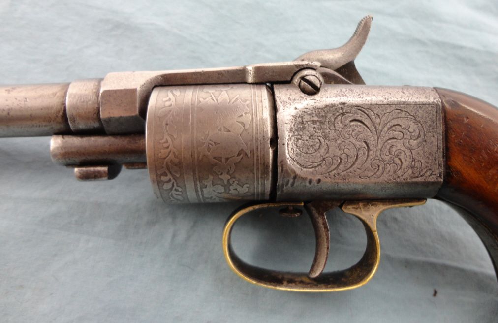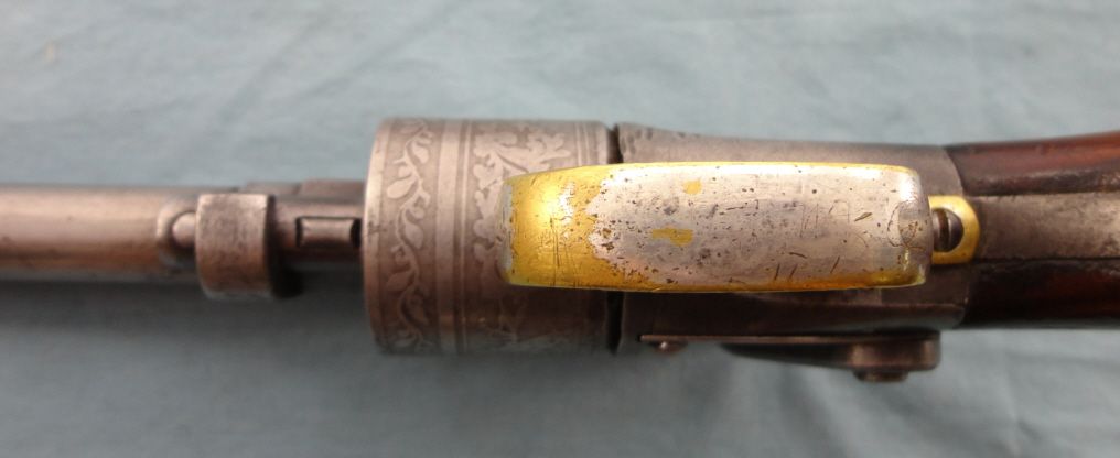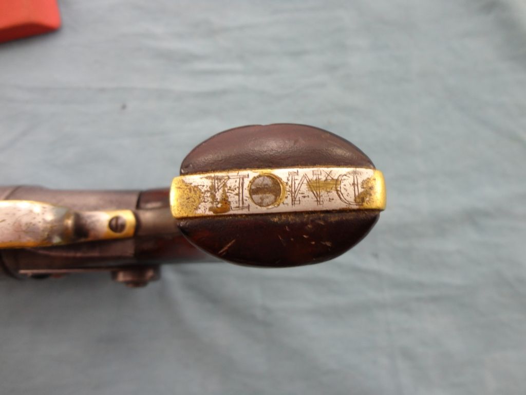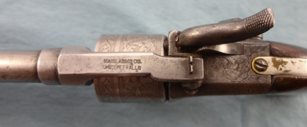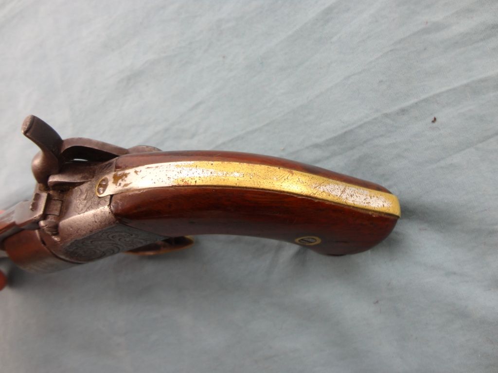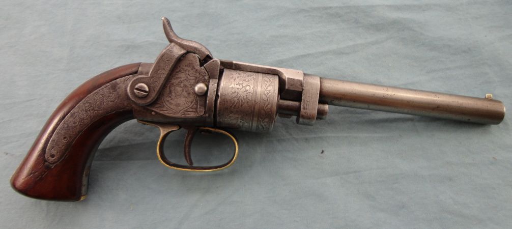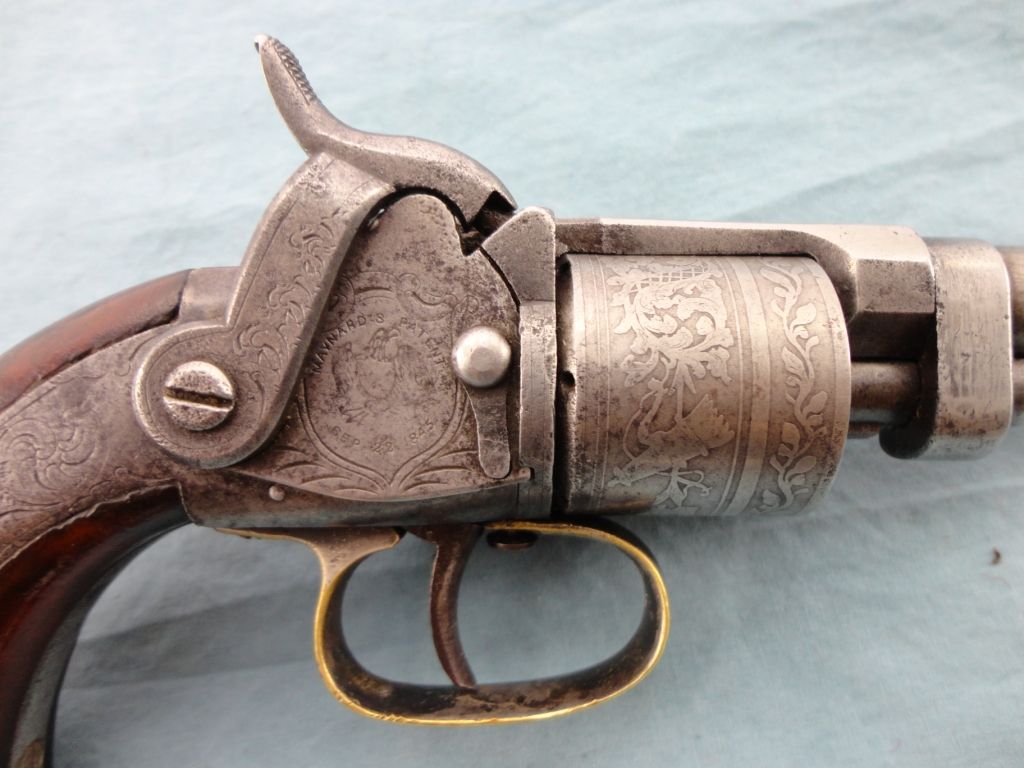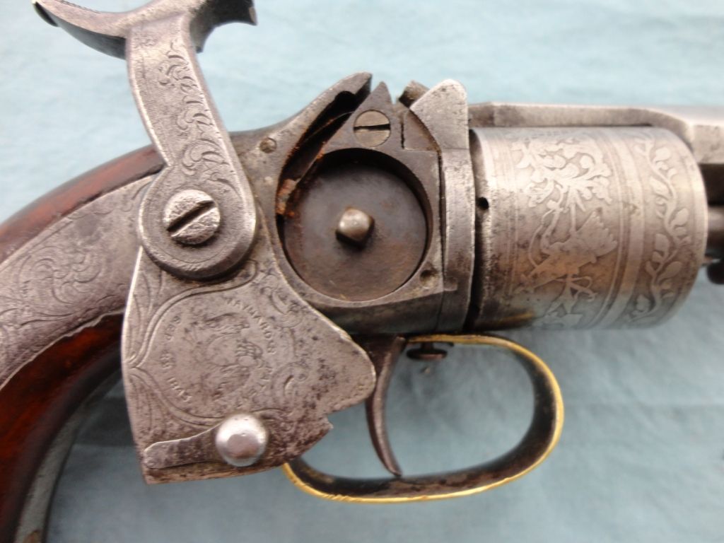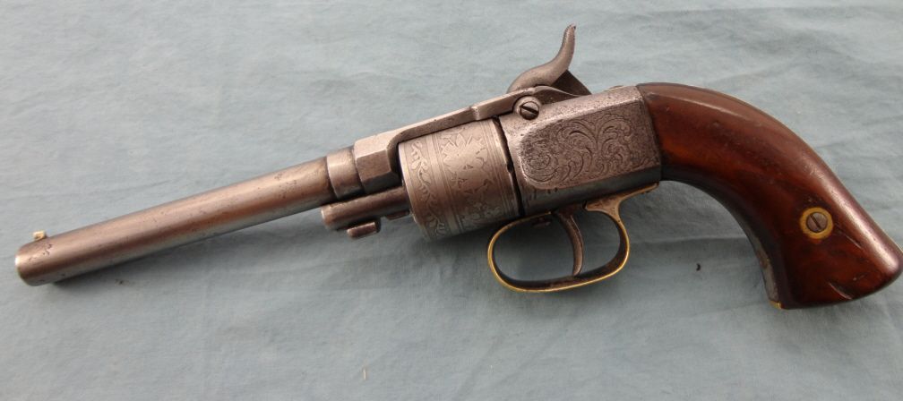 Antique. 31 cal. w/6shot floral & military etched cylinder. John Brown model w/rare 5 1/2" bbl. Tape primer mechanism in working order. Gun shows original engraving on receiver. Some original silver remains on brass grip straps. Initials "DML" on bottom of butt. Mechanically fine & a rare example of a desirable early side arm. It is known that 200 of this model was sold to the abolitionist John Brown for his use in 1857. Only approx. 1,000 total were manufactured. Also interesting was the re-designed hand turning cylinder after loosing a patent infringement case w/Colt.