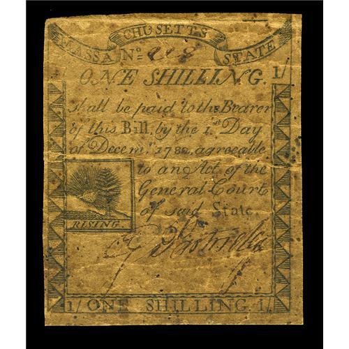 <B>Massachusetts 1779 1s Very Good.</B></I> The paper on this note is thick and firm though well aged and spotted.