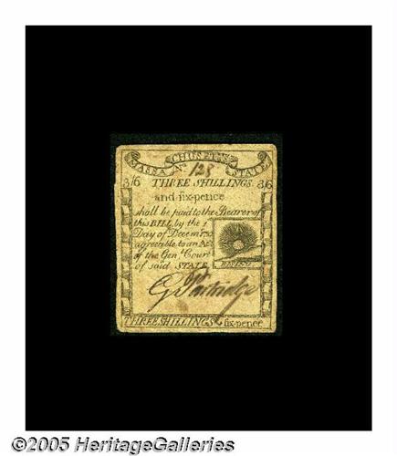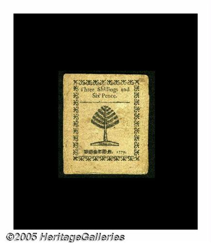 <B>Massachusetts 1779 3s/6d Choice Very Fine.</B></I> A lightly circulated, ideally centered Rising Sun note without a hint of a problem. This Rising Sun issue was printed from face plates that had been engraved by Colonial printer, silversmith and legendary forefather Paul Revere, who also printed the faces of the notes themselves. The backs employed set-type and cast cuts from the previous Codfish issue and were printed by Thomas Fleet.