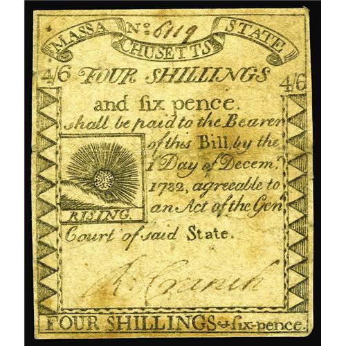 <B>Massachusetts 1779 4s/6d Very Fine.</B></I> A beautiful problem-free Rising Sun note, with perfect paper quality for the grade. There are some very minor stains and a few meaningless pinholes, but the note has wonderful print quality and terrific eye appeal. An underappreciated issue that is consequently undervalued.