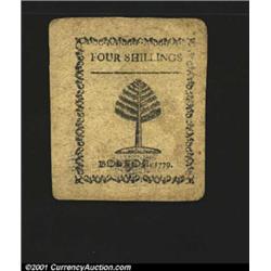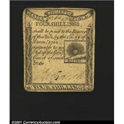 Massachusetts 1779 4s Choice Very Fine.<p>A well printed and very attractive example of a Paul Revere-engraved Rising Sun note. The corners are slightly rounded, but the rounding does not touch the design. Important notice: We expect to be auctioning lots at the rate of 200-250 per hour. Sometimes eBay Premier live bid software cannot keep up with that pace, so we strongly recommend that you place a realistic proxy bid now as insurance to avoid disappointment. Also please note that all Heritage/CAA lots purchased through eBay Premier carry a 20% Buyer's Premium.