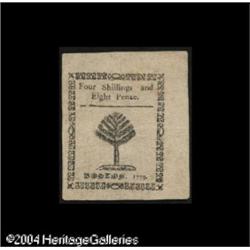 Massachusetts 1779 4s8d Extremely Fine. A lovely, l <B>Massachusetts 1779 4s8d Extremely Fine.</B></I> A lovely, lightly circulated Rising Sun note, with broad margins and perfect printing quality. The face plate for this note was engraved by Paul Revere, and the faces where also printed by him. The backs re-used cast cuts from the Codfish issue, and were printed by Thomas Fleet. In all our sales combined, we've handled fewer than ten Rising Sun notes with this eye appeal and beauty. To this cataloger, no Colonial Currency is more evocative of the period than these aesthetically pleasing notes produced by, and for, our founding fathers. <BR><BR><B>Important notice:</B> Heritage usually auctions material at the rate of 200-250 lots per hour. On some occasions eBay Live bid software or the Internet may not be able to keep up with the pace of the auction. We recommend placing a realistic absentee bid now as insurance to avoid disappointment. Occasionally the auctioneer may eliminate or reject an eBay Live bid, and the auctioneer may also reopen a lot after the close of the eBay live bidding (usually because we missed an audience bid), and may reject your bid even if it shows you as the winning bidder. By bidding via eBay Live, you agree that Heritage may award the lot to another bidder at its sole discretion under the circumstances described above or any other reasonable circumstances. Since eBay bids are not shown to us until we open the lot on the floor, we treat those bids just like floor bids. In most cases the floor responds before the eBay bid is presented to us, due to Internet lag time, so for consistency we have made it a policy that floor bids are always considered first over tie eBay live bids. Also please note that all Heritage lots purchased through eBay Live carry a 20% Buyer's Premium. Please make sure you read the Terms and Conditions before you bid. This lot is being auctioned in conjunction with a live floor auction by Heritage Galleries & Auctioneers. All final auction and invoice information will be supplied by Heritage Galleries & Auctioneers, and all other information should be considered preliminary. Lot:15148