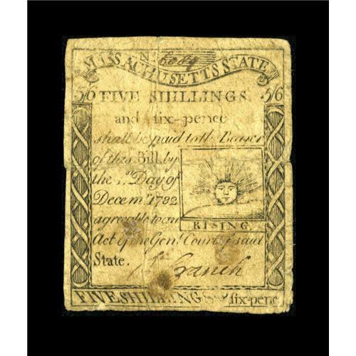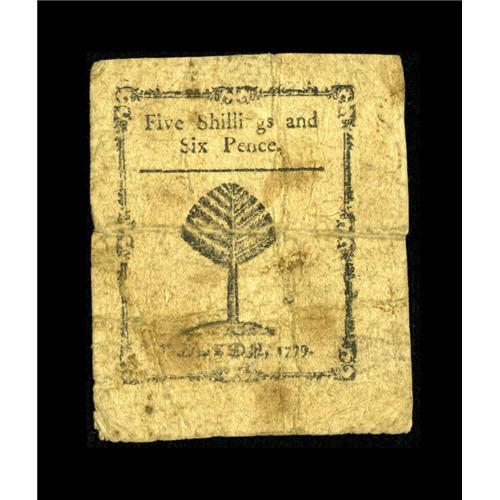 <B>Massachusetts 1779 5s/6d Fine.</B></I> This is a nice circulated example of this extremely popular issue. The face plates for this issue were engraved by Paul Revere and in fact the faces of the notes were printed in his shop. The back uses the same type and cast cuts that were previously employed on the Codfish issue and they were printed in the shop of Thomas Fleet.<BR><BR><b>Shipping:</b> Coins & Currency (<a target="_blank" href="http://www.heritageauctions.com/common/shipping.php">view shipping information</a>)