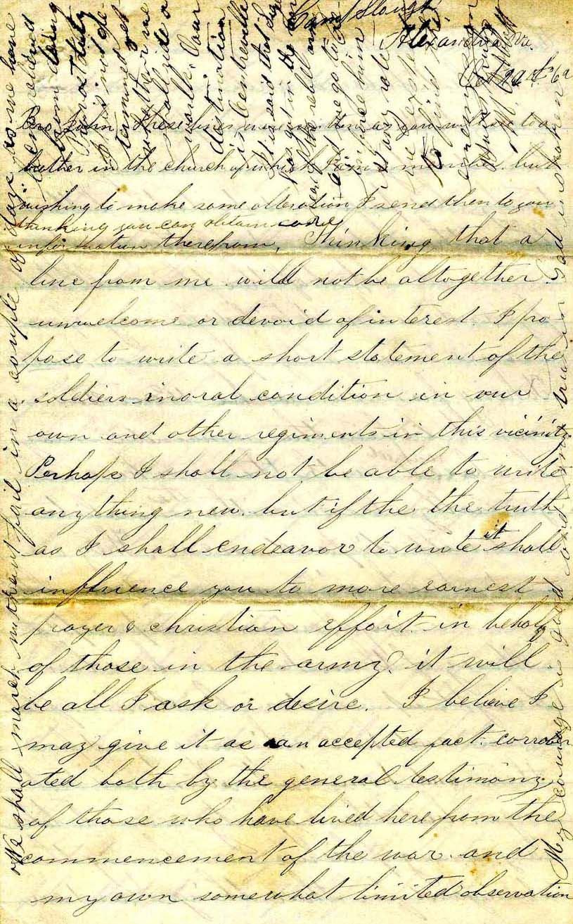 8pp. letter from William O. Abbott of the 33rd Massachusetts Infantry, Company F. Accompanied by cover. Written in ink and datelined Alexandria, Virginia, October 1862, letter reads in part: ''...the 33rd Regt Mass Vols is one of the best behaved and most orderly of any that has ever encamped or done Provost duty near or in this city...Taking from our ranks 150 or 200 men I believe the remainder may be ranked with those who are generally classed with the moralists and well disposed men. They are not church going men and care little for the Gospel ordinances...the majority...are rapidly turning into the more open and dangerous paths of sin...The officers of the regiment I believe all use liquor...without a single exception and the privates only imitate their example. The chief vice or the one most marked is that of profanity This is possibly no more prevalent than the drinking. Those who resist this sin in all its forms are very rare...Col Magg told the regt last Sunday that both intemperance and profanity must cease...But of what avail is it for him to threaten or punish while he is guilty of the same crimes...I heard him on the next day Monday after the above order use profane language...We shall march without fail in a couple of days as we have been relieved from doing...duty It is not determined yet whether we shall ride or walk. Our destination is Centreville...At any rate we expect to find the enemy soon...'' Abbott mustered into Company F on 5 August 1862 and mustered out 20 June 1865. After he wrote this letter, the 33rd Massachusetts Infantry went on to fight at Chancellorsville, Gettysburg and Kennesaw. Ink letter measures 5'' x 8''. Light soiling and minor separation at folds, otherwise near fine condition.