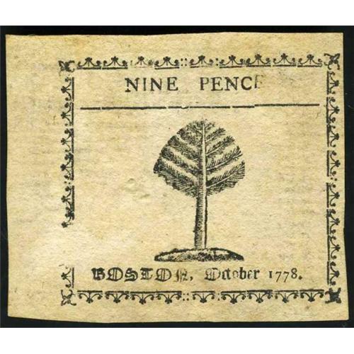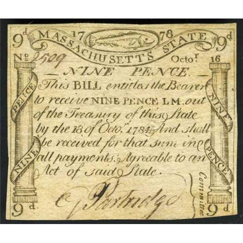 <b>Massachusetts. 9 Pence Colonial currency. Choice Crisp Unc.</b> Massachusetts State note October 1778 issue. Pine tree on back. The hyperinflation of 1780-81 caused what is known in currency lore as a "revulsion" by the public who refused to used unbacked paper money anymore and instead demanded gold and silver.