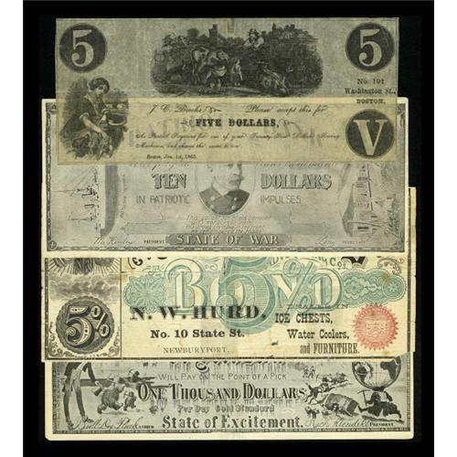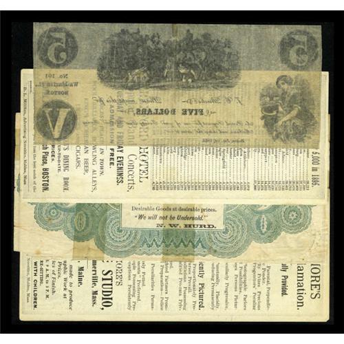 <B>Massachusetts Ad Notes.</B></I><BR> Boston, MA- Hotel Rexford Ad note <B>AU</B></I><BR>Boston, MA- J.C Brooks Ad note <B>VF, </B></I>small repairs<BR>Newbury Port, (MA)- N.W. Hurd Ad Note, <B>Fine, </B></I>repairs, corner tip missing<BR>West Somerville, MA- Whittemores Studio Ad Note <B>CU</B></I>.<BR><BR><b>Shipping:</b> Coins & Currency (<a target="_blank" href="http://www.heritageauctions.com/common/shipping.php">view shipping information</a>)