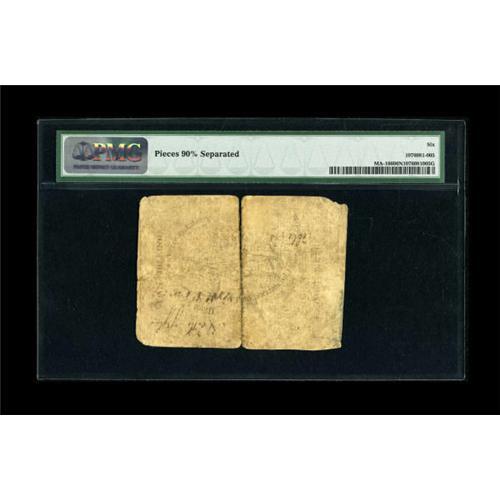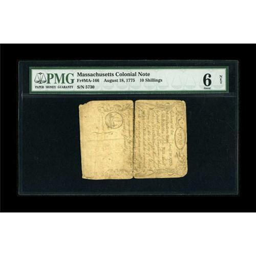 <B>Massachusetts August 18, 1775 10s PMG Good 6 Net.</B></I> The plates for both the face and back of this note were engraved by Paul Revere and printed in his shop. This is only the second one of these we have handled with the last occasion being over four years ago. The PMG label reads, "pieces 90% separated." This note is almost two separate pieces, but it is still popular and scarce enough to command. . .<BR><BR><b>Shipping:</b> Coins & Currency (<a target="_blank" href="http://www.heritageauctions.com/common/shipping.php">view shipping information</a>)