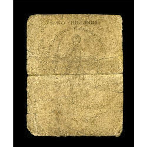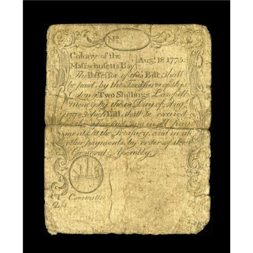<B>Massachusetts August 18, 1775 2s Fine.</B></I> The details of this note match those of Newman's plate note exactly, allowing us to conclude this was printed from the same plate (minor variances of the hand engraved designs exist from plate to plate). The historical significance adds to the appeal of this popular design. This issue was both engraved by Paul Revere and printed in his shop just a few months after his famous ride. This piece was once sewn together along the center fold, but has since been professionally repaired.<BR><BR><b>Shipping:</b> Coins & Currency (<a target="_blank" href="http://www.heritageauctions.com/common/shipping.php">view shipping information</a>)